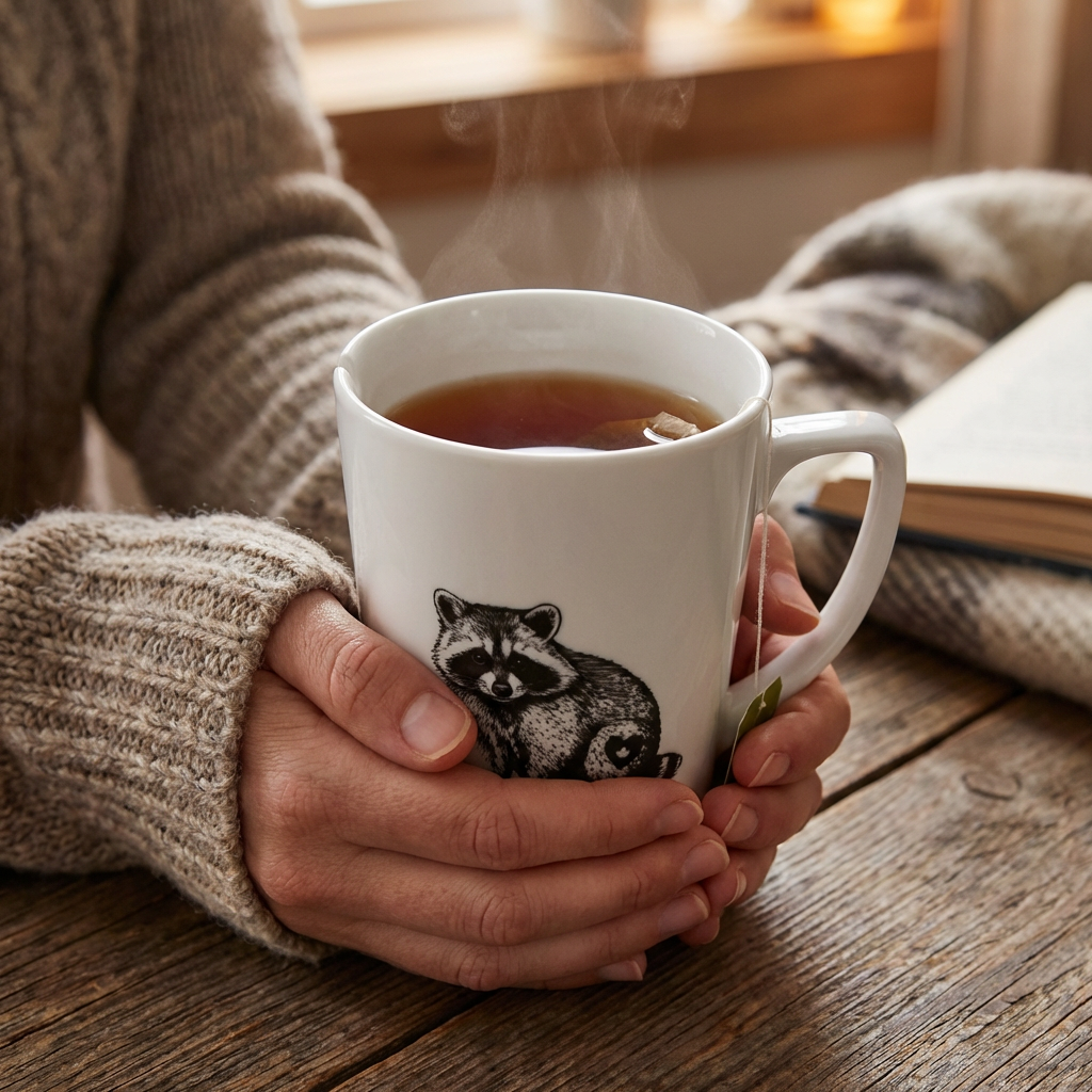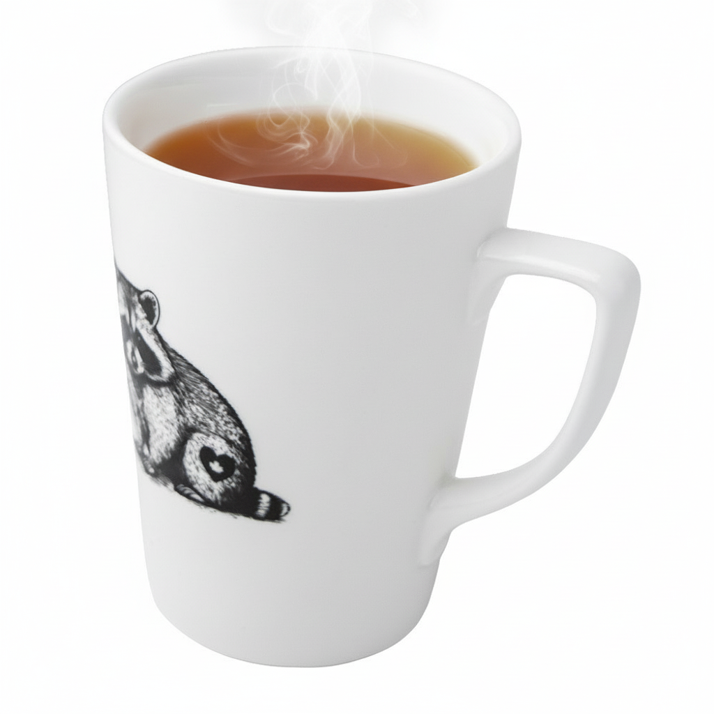 Enjoy your tea with extra charm in this high-quality porcelain tea mug, featuring an adorable Canadian Raccoon print. Cadmium-free, double-fired, and chip-resistant, it includes a clever built-in slot on the rim to hold your tea bag, keeping things neat and cozy. With an 11.8 oz / 350 ml capacity and printing done in Canada, it’s the perfect mug for slow sips and warm moments.