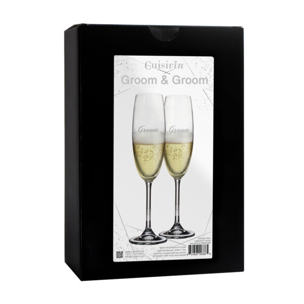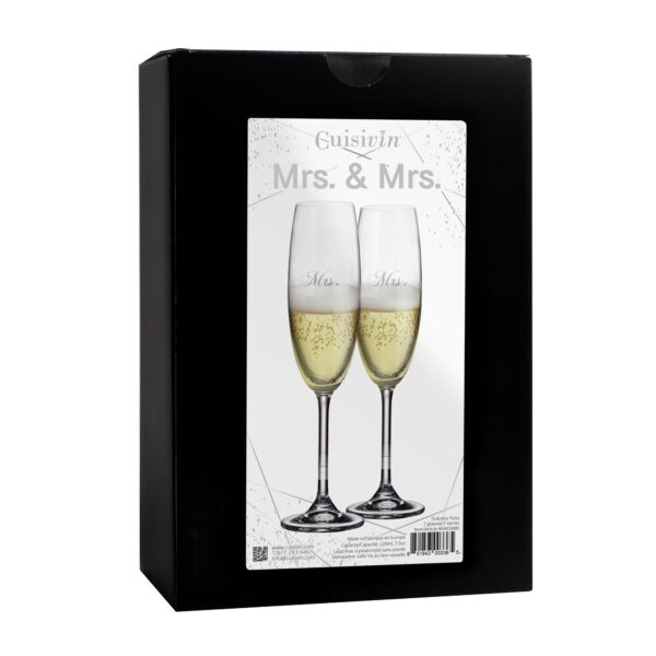 Raise a toast to the happy couple with these specially designed glasses! Lead-free crystal glasses, made in Europe with frost coloured print. Ideal for wedding registries, anniversary and wedding gifts. Gift set includes 2 Champagne Flutes in gift box. Print “Bride & Bride”