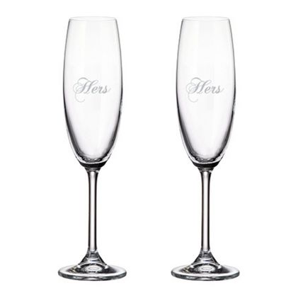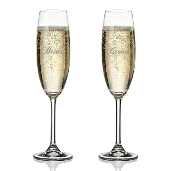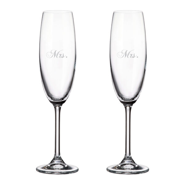 Raise a toast to the happy couple with these specially designed glasses! Lead-free crystal glasses, made in Europe with frost coloured print. Ideal for wedding registries, anniversary and wedding gifts. Gift set includes 2 Champagne Flutes in gift box. Print “Bride & Bride”