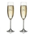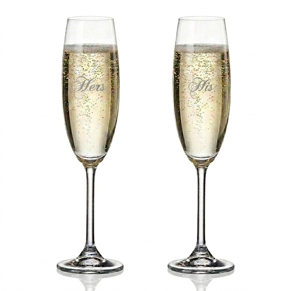 Raise a toast to your favourite couple with these specially designed glasses! Lead-free crystal glasses, made in Europe with frost coloured print. Ideal for wedding registries, anniversary and wedding gifts. Gift set includes 2 Champagne Flutes in gift box. Print “His & Hers” Capacity: 7.5oz / 220ml. Dishwasher safe.