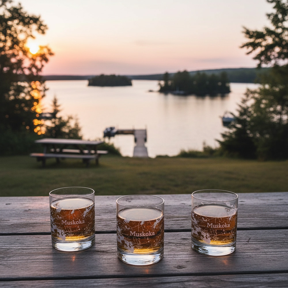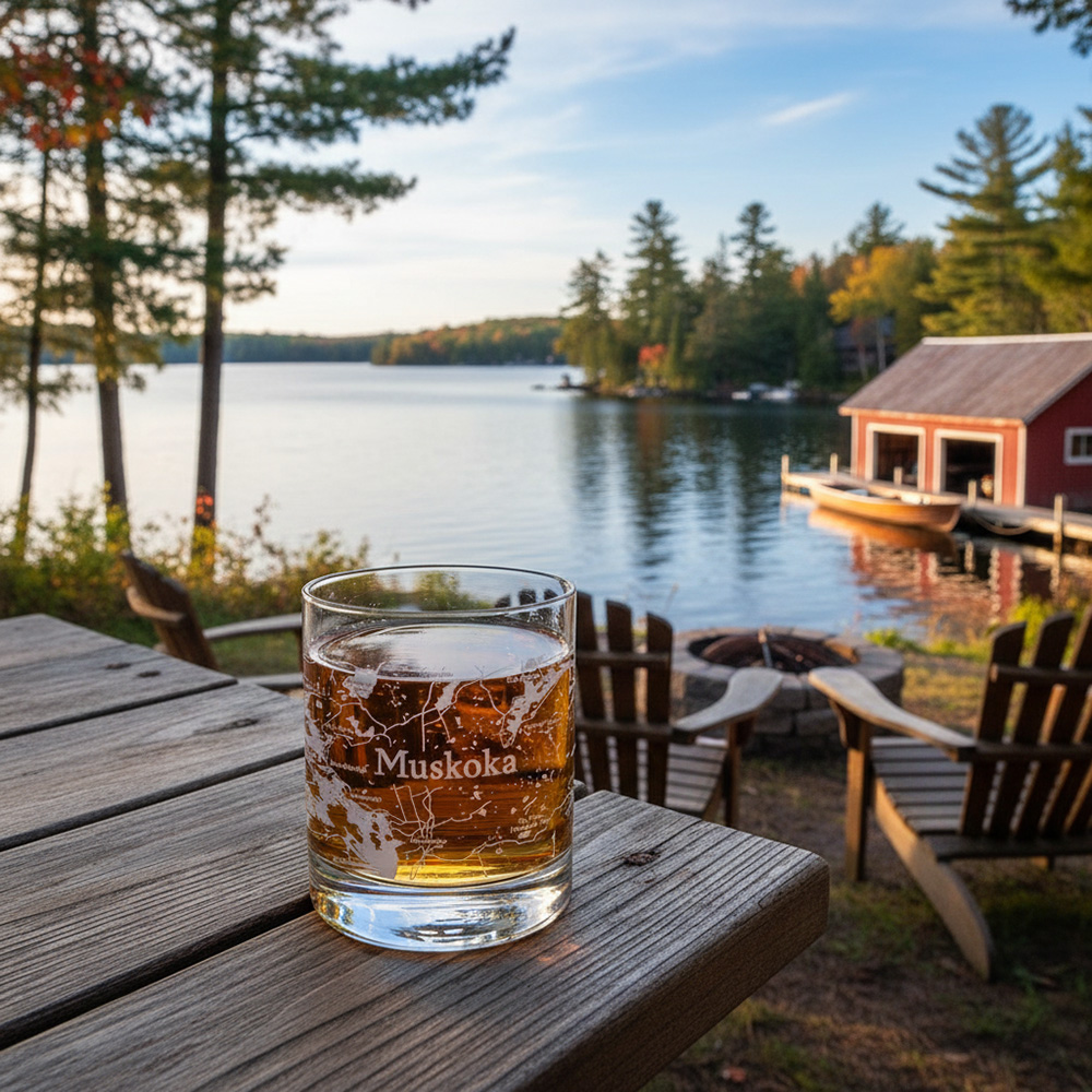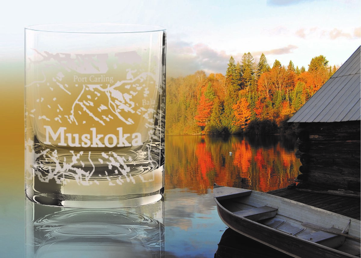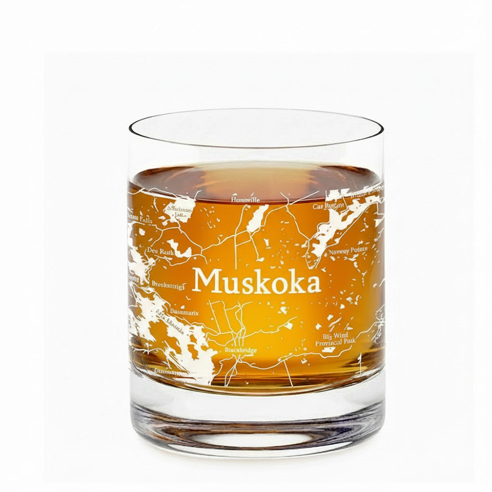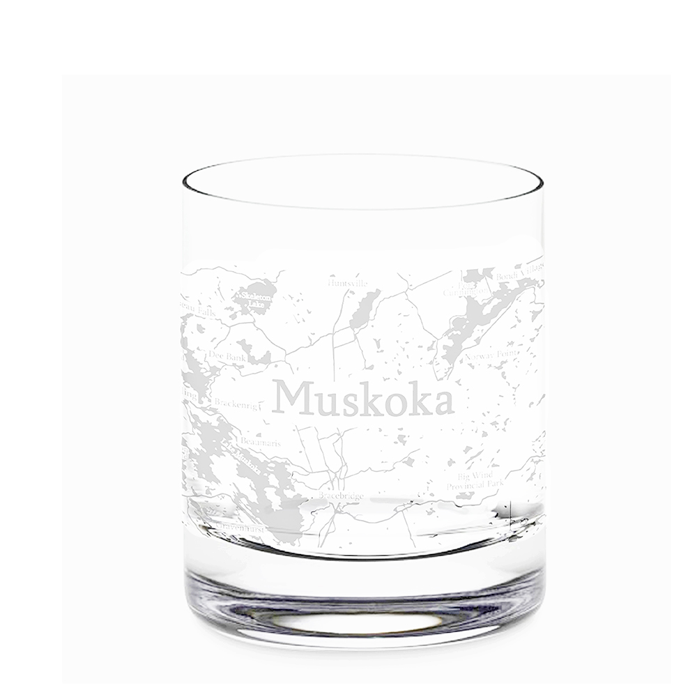 Show your city pride! Unique map design glasses on a traditional lead-free crystal whisky glass. Full wrap-around Muskoka map print in frost colour.