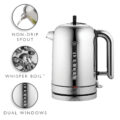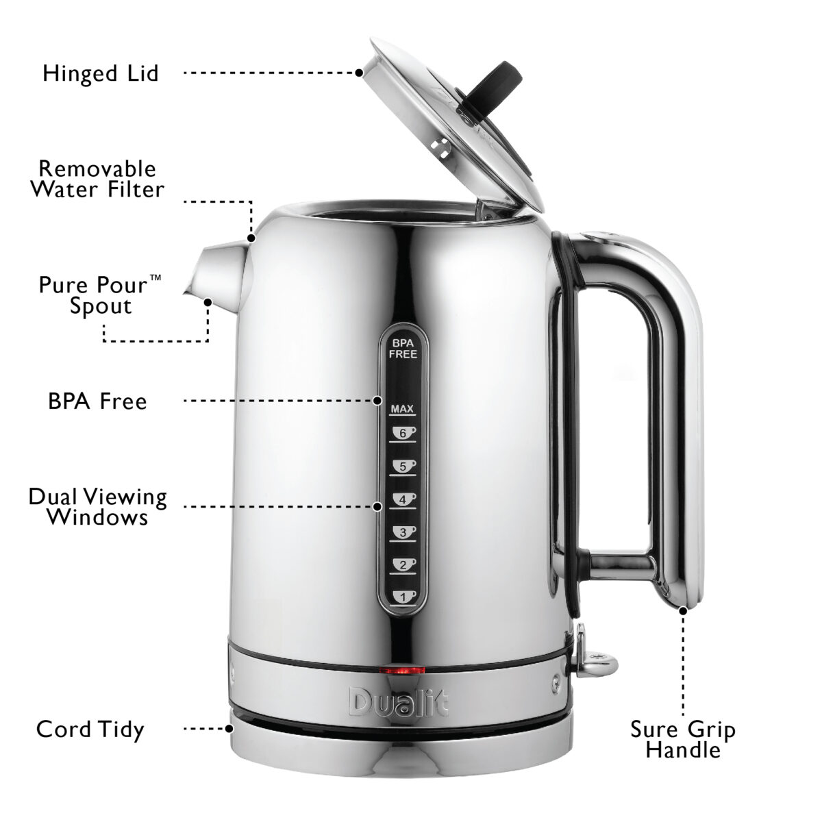 The Classic Dualit Kettle is the epitome of simplicity and sophistication. This retro inspired kettle makes a perfect companion to the Classic Dualit Toaster. The multi-patented Classic kettle features WhisperBoil technology to dramatically reduce boiling noise. The kettle features two, BPA-free measuring windows with cup level and litre indicators. The 3kw element rapidly boils water for the perfect cup of tea. Limited 1 year warranty