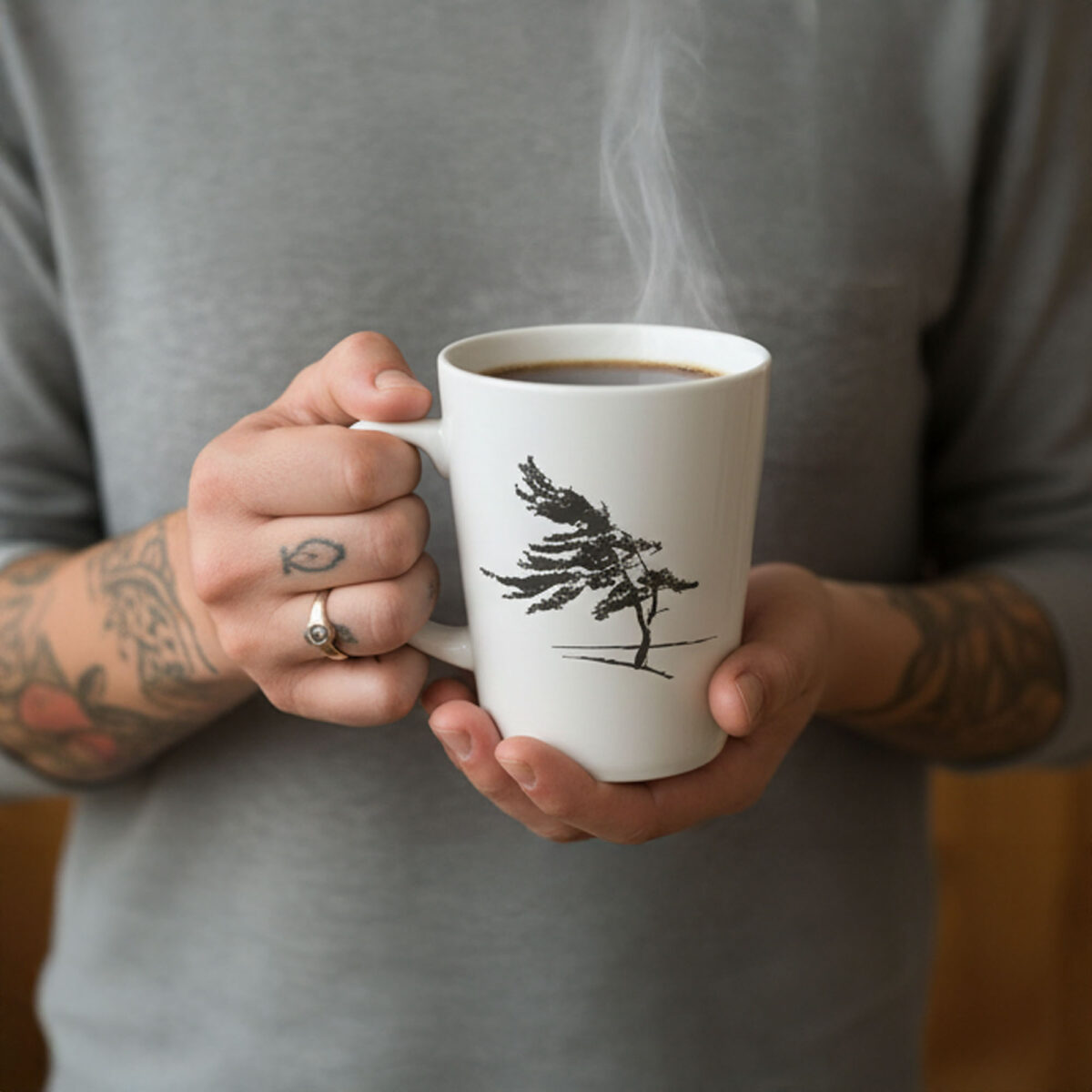 Inspired by resilient coastal trees, the Windswept West print brings calm, minimalist beauty to your daily ritual. This high-quality porcelain mug is cadmium-free, double-fired, and chip-resistant—made to last through countless refills. With a generous 13.8 oz / 400 ml capacity and printing done in Canada, its an understated design that brings calm, coastal character to every sip.