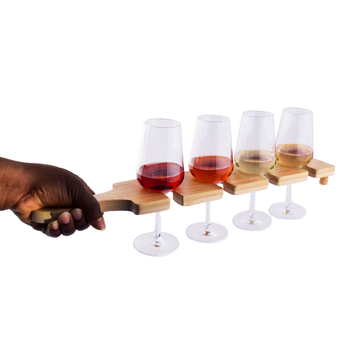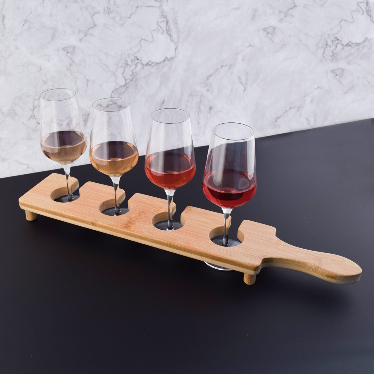 Enjoy wine tastings at home with your favorite glasses! The universal wine fight board is specially designed to hold most wine glasses allowing you to create a restaurant style wine flight experience at home. Made of solid bamboo, the wine flight board features a drop-through paddle for easy transportation. Glasses NOT included.