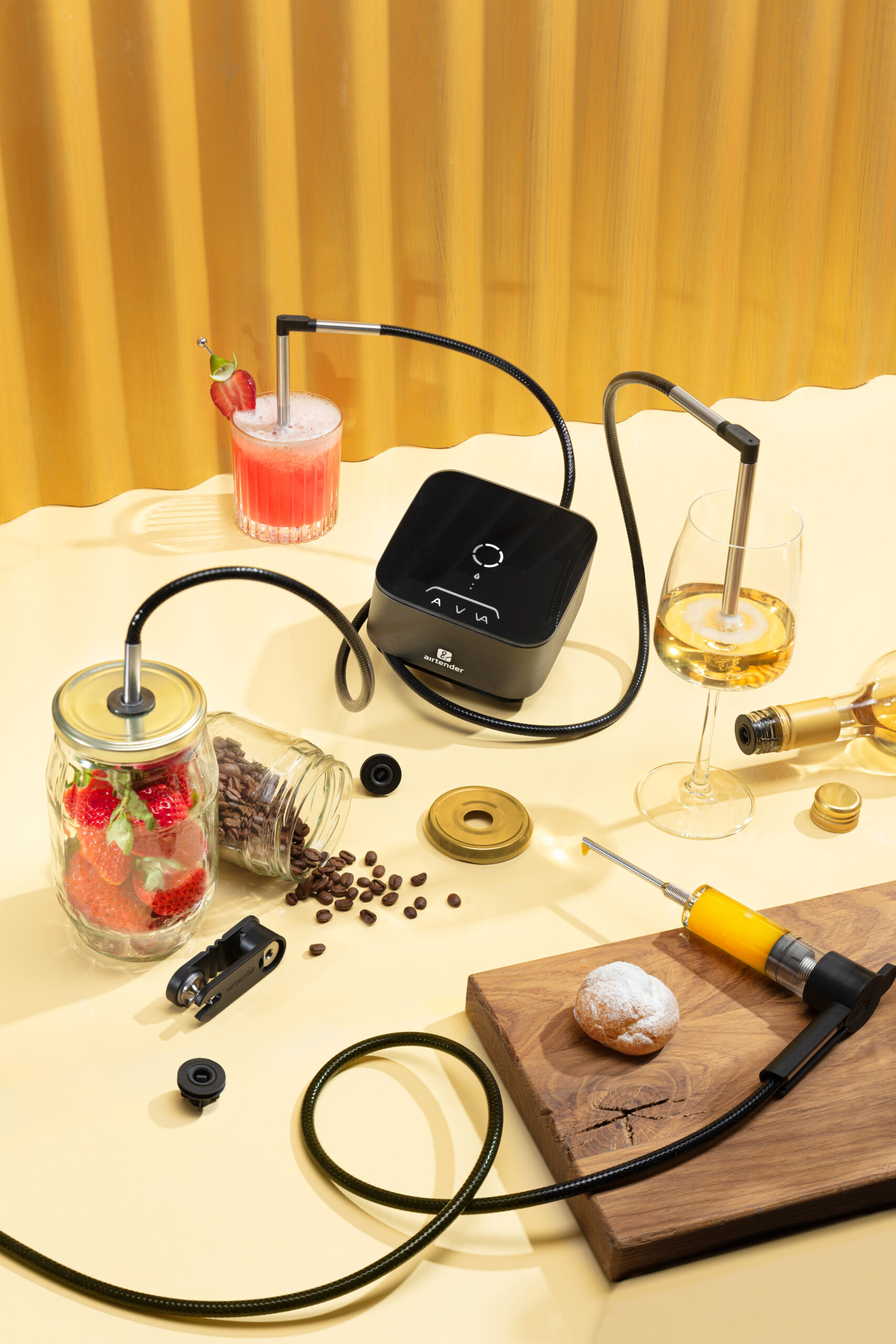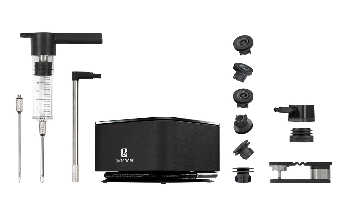 Maximize taste and minimize waste with the innovative Airtender system, a game-changer for your kitchen and home bar. This cutting-edge electric model uses air pressure and deep vacuum technology to preserve freshness, enhance flavors, aerate wine, and more. The vacuum function is perfect for sealing wine bottles and food jars with the patented nano-stoppers. Airtender keeps your wine and foods fresh up to five times longer than traditional storage methods. The nano-stopper fits cork and screw-cap bottles with a low profile allowing for 100% leak-proof horizontal storage. With the lid punch, you can transform any glass jar or bottle with a metal lid into a vacuum food container. Simply use the specialized tool to safely cut a hole in the lid; insert one of the versatile Nanostoppers; and in seconds, pump out oxygen and seal in freshness and flavour. The air function releases millions of microscopic bubbles to aerate wine, mix and foam cocktails, and enrich soups and sauces in seconds. The visual spectacle releases the complex aromas and flavors of food, wine or craft cocktails without the need for a shaker. The set also include a fluid injector to infuse marinades into meat and fillings into baked goods. Elegantly packaged for gift-giving, this comprehensive set also includes a wall mounting plate for convenient storage.