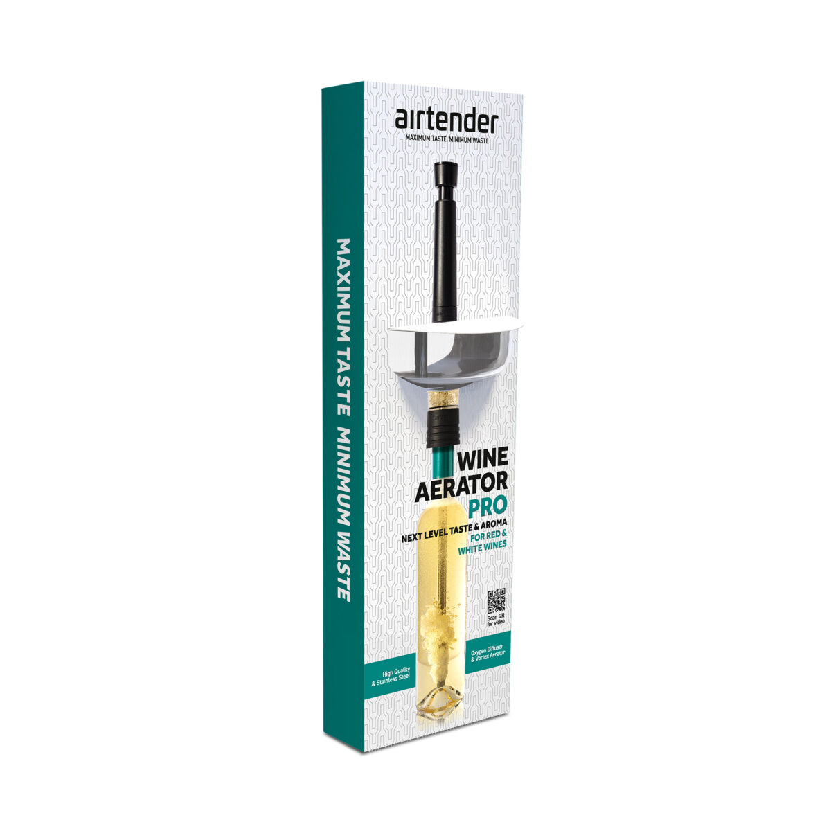 The Airtender Pro is the epitome of wine aeration innovation, utilizing two types of aeration to maximize aroma and flavours directly in the bottle. With a few clicks of the hand pump the first form of aeration begins – micro oxygen infusion: the innovative stainless steel diffuser atomizes air to create a mesmerizing whirlwind of millions of microscopic air bubbles within the bottle, which are instantly absorbed by the wine. Next, the loop funnel placed on top of the bottle, elegantly collects the micro infused wine rising from within and lets the wine return to the bottle creating vortex aeration. In less than 60 seconds, the full bottle of wine is aerated to enhance flavours and aromas. The Airtender Pro transforms any bottle of wine into a visual spectacle! Made in the Netherlands with the highest quality materials and manufactured with a focus on sustainability and social responsibility principles: advanced CO2 friendly production facilities; manufactured with recycled and sustainable materials; assembled and packaged by people with disabilities. Maximize taste and minimize waste with Airtender.