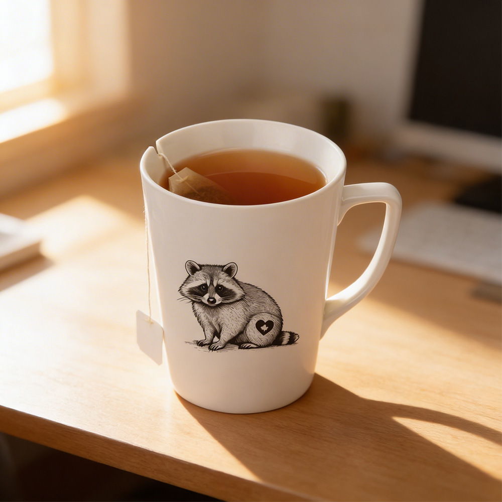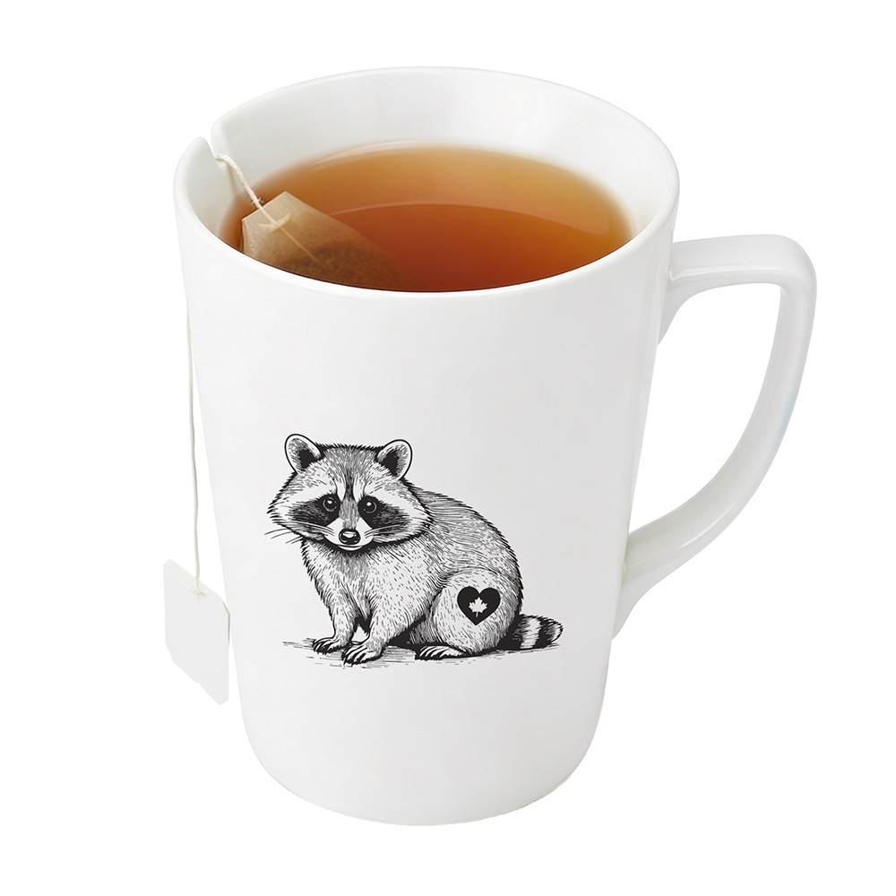 Enjoy your tea with extra charm in this high-quality porcelain tea mug, featuring an adorable Canadian Raccoon print. Cadmium-free, double-fired, and chip-resistant, it includes a clever built-in slot on the rim to hold your tea bag, keeping things neat and cozy. With an 11.8 oz / 350 ml capacity and printing done in Canada, it’s the perfect mug for slow sips and warm moments.