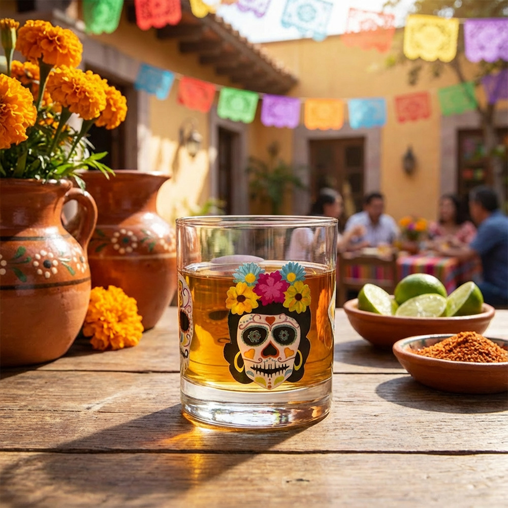 Toast salud to family and friends with these exquisite Day of the Dead inspired glasses. The wrap around print features beautiful bold colours and intricately designed sugar skulls. Perfect for enjoying cocktails, whisky, juice, water and other beverages.